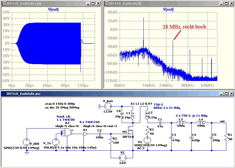 Hallo Dil Die Simulation entspricht ungefähr der Schaltung im Link: http://www.qsl.net/va3iul/Homebrew_RF_Circuit_Design_Ideas/10W_HF_PA_MOSFET_LU8EHA.gif Zwei Dinge gefallen mir nicht: 1. Das Einschwingen geschieht schön rund, aber das Ausschwingen ist eckig. Sowas erzeugt einen Klick, möglicherweise aber bei der Leistung noch nicht so tragisch. 2. Die Harmonische bei 28 MHz ist IMO noch zu stark. Gruß, Bernd