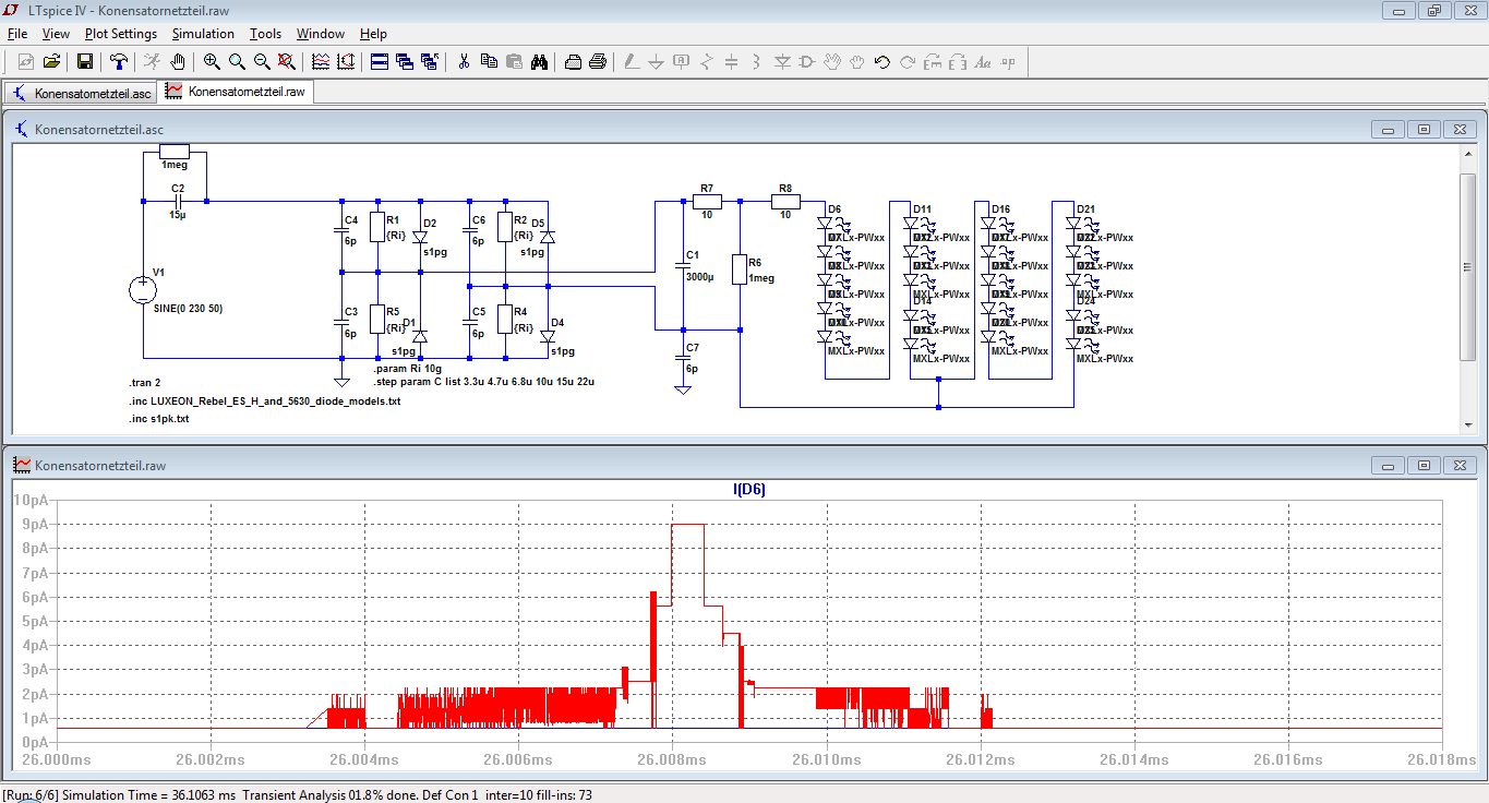 Hallo! Ich hab mit dem Gedanken gespielt, mir eine LED Lampe zu bauen. Gute LEDs mit gutem Licht und ~35 Lumen gibts ja schon um nichtmal 30Cent. Die "einzige" Aufgabe dabei ist ja die Stromversorgung. Also mal ein Kondensatornetzteil simulieren. Nach kurzem suchen der Modelle für die ausgewählten LEDs und Dioden und zeichnen der Schaltung im LTSpice gibts bereits Probleme. Bei bestimmten Bauteilwerten (vor allem für C2) rechnet er sich am Anfang (so um die 20ms) in irgendwas rein. Mit 5 Dioden gehts noch, da rechnet er bei bei dieser Zeit so 30s herum, wenn man mehr dazuschaltet gehts überhaupt nicht mehr. Auch das Hinzufügen von Kondensatoren und Widerständen hat bis jetzt noch nichts gebracht. Weiß jemand wieso man das so nicht simulieren kann? Danke für eure Hilfe