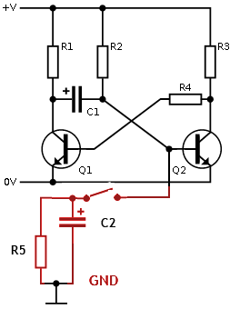 soeben habe ich mit ein wenig Rumexperimentieren rausgefunden, dass man den gewünschten Effekt mit einem standard Monoflop (siehe Link von Thomas) und einem RC parallel hinter dem Taster auf GND hinbekommt (also einen Taster auf die Basis von Q2 auf die R5 und C2, die wiederrum auf Masse). Nennen wir diese mal R5 und C2. R5 = 10k und C2 = 1µ Nun muss ich nur noch verstehen warum es geht. 1: C2 ist klar, der lädt sich über R2 auf wenn der Taster gedrückt wurde. 2: Zeitgleich sperrt Q2 bis C2 aufgeladen ist. 3: Wird der Taster weiter gedrückt gehalten (das hier habe ich noch nicht ganz verstanden was dann passiert). 4: Es wird der Impuls ausgegeben (Auch noch nicht ganz verstanden) 5: Läßt man den Taster los, entlädt sich C2 über R5. Das geht recht schnell. Zusätzlich würde ich gerne wissen, wie man die Zeit korrekt ermittelt. Bei R2 = 10k, C1= 22µ habe ich 132ms gemessen. Lt. der entsprechenden Formel 0.154ms was ja ganz gut hinkommt. t=0.7 R C Ist das der korrekte Weg? Und Punkt 3. muss ich noch eine Antwort finden :-)