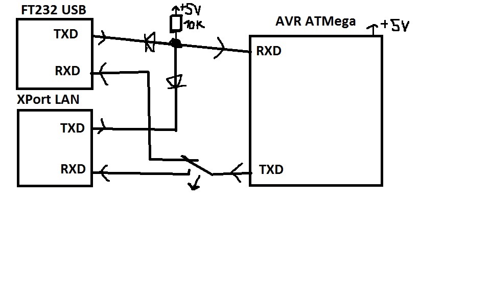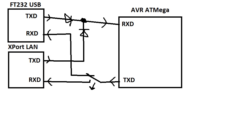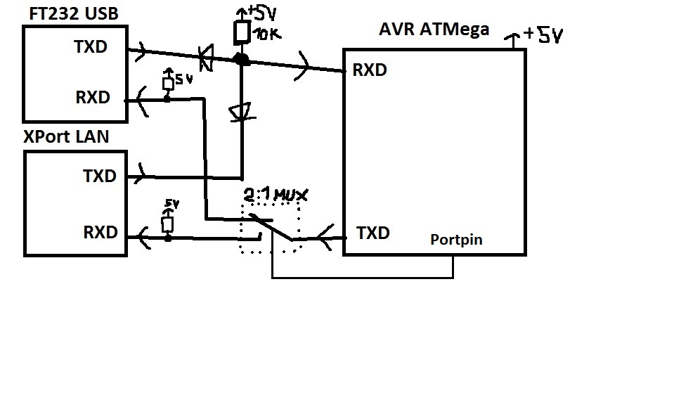 Hallo Liebe Elektronikfreunde Ich habe zur Kommunikation mit meinem AVR einen XPort um über LAN zu kommunizieren und einen FT232 für USB parallel dazu. Es soll auswählbar sein ob nun über LAN oder USB kommuniziert wird. Dazu hätte ich einfach die Transmit Leitungen TXD über Dioden an den RXD Eingang des AVR gehängt. Das TXD vom AVR soll über ein Schalter (MUX) entweder an den XPort oder den FT232 gegeben werden. Funktioniert das so mit den Dioden oder gäbe es eine schönere Lösung?