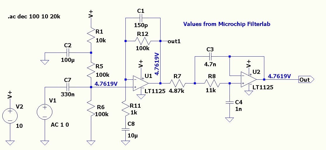 So, ich bin leider erst jetzt dazu gekommen. Schau dir mal das Ergebnis an. 10kHz Grenzfrequenz kommt etwa hin. Mit der Verstärkung kannst du noch spielen, die wird bestimmt durch R3/R4 in der ersten Stufe und R11/R12 in der zweiten Stufe. Die krummen Werte, die du für die beiden Filterstufen berechnet hast, habe ich mal so gelassen, die kanst du selbst noch auf handelsübliche Werte bringen. So, jetzt hast du was zum Spielen :-)
