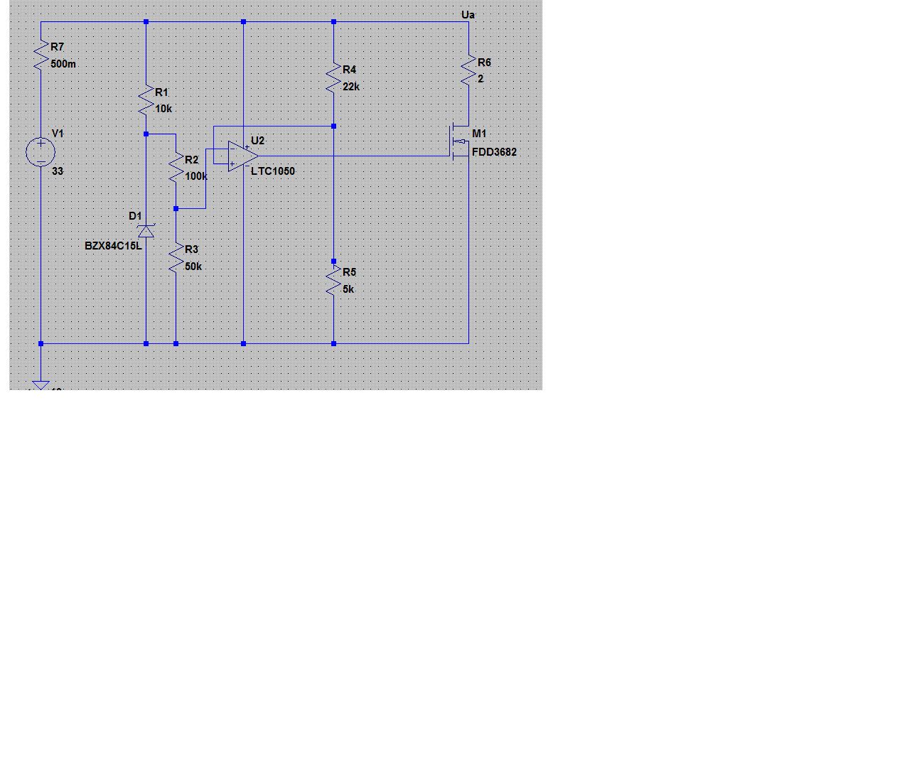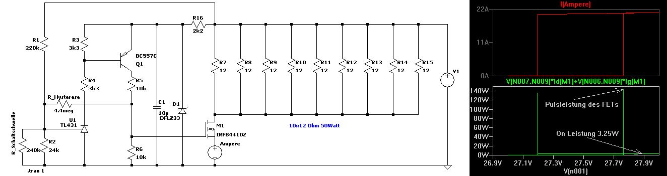 Hi, da es ausreicht die Spannung zwischen 12 und 28V zu halten, würde ich keine Leistung in einem Transistor verbraten. Einfach mit einem FET Lastwiderstände einschalten und fertig. Die Schaltung im Anhang ist, in dieser Dimensionierung, aber nicht praxiserprobt, deshalb keine Garantie für Rauch und Gestank. Grüße