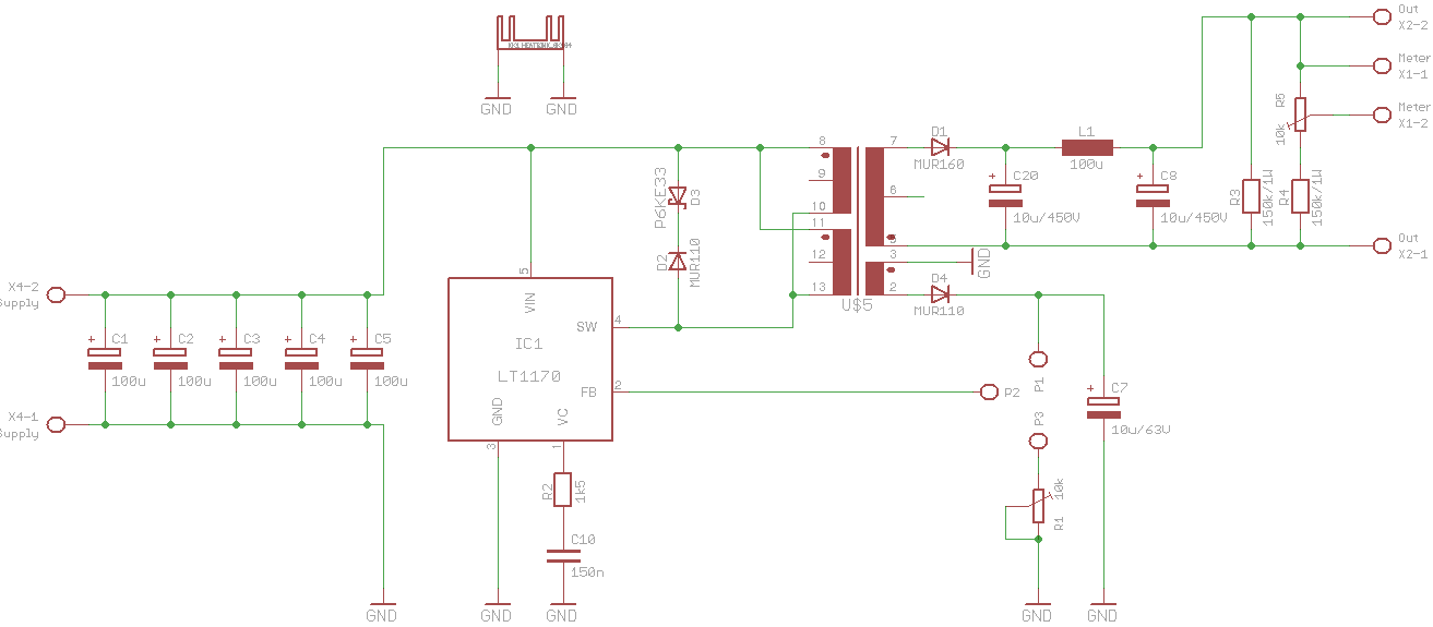 Hi zusammen, die Schaltung sollte aus +12V 20-300V regelbar erzeugen, funktioniert auch prinzipiell. Nur ist mir eben bei der Inbetriebnahme die Suppressor-Diode im Snubber abgeraucht. Konkret hab ich mich mit dem Trimmer R1 bei voll aufgedrehtem Haupt-Poti (im schaltplan schwer erkennbar, hängt an den Anschlüssen P1..P3) an die Maximalspannung von 300V herangetastet, bei etwas über 250V ist das Labornetzteil in die Strombegrenzung (1.5A) gegangen, Ausgangsspannung von 12V auf etwa 4V eingebrochen, dann hats geraucht, ich hatte zuerst die D2 (MUR110) im Verdacht, aber es war die D3 (P6KE33) Die Schaltung funktioniert jetzt eh immer noch, die Spannung am SW-Pin des LT1170 erreicht ca. 70V (um 10V zuviel, die sollte ja eigentlich der Snubber wegknabbern) Jetzt frag ich mich, was da passiert ist? Verdacht: die D2 (MUR110) hat die Peak Reverse Voltage überschritten, wurde leitend, und hat die D3 in den Tod gerissen? Abhilfe: D2 durch eine MUR160 ersetzen? (oder jedenfalls durch etwas mit mehr als 100V Reverse Voltage, MUR110 und 160 hab ich halt grad vorrätig) oder ist an der Schaltung sowieso irgendwas ganz im Argen? Info zum Übertrager: Ist ein Flyback Transformer, links je 10uH, rechts 500uH für den Ausgang, 6uH für die Hilfswicklung)