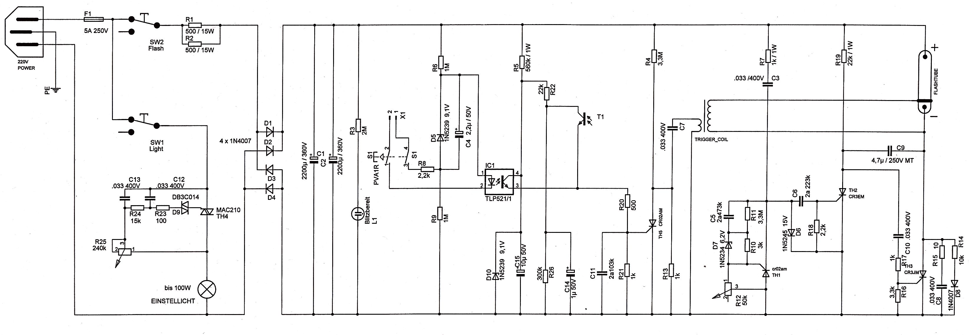 Hier findest Du sehr gute beschreibungen der elektrischen Parameter von Entladungslampen: - http://www.heraeus-noblelight.com/media/webmedia_local/media/pdf/af/LampBook_0711.pdf - http://www.perkinelmer.de/PDFS/downloads/dts_applicationnotehighperformanceflash_final071004.pdf Die Dokumente enthalten auch Symbolschaltbilder für typischen Ansteuer-Schaltungen. Normalerweise macht man das nämlich anders, als Du es mit machen wölltest (Schaltbild im Eingangsposting): Die Energie wird in Kondensatoren gespeichert die direkt über der Lampe hängen - die Spannung reicht aber nicht aus um das Gas in der Lampe zu ionisieren, sie zündet also nicht. Nun kommt der Trigger-Trafo ins Spiel, der entweder direkt in Serie zur Lampe sitzt (dann muss die Sekundärwicklung aber auch den Impulsstrom tragen können) oder auf eine extra Trigger-Elektrode an der Lampe geführt wird. Die Ausgangsspannund des Trigger-Trafos ist wesentlich höher als die typischen Spannungslevels in den Speicherkondensatoren und muss sicher das Gas in der Lampe ionisieren können - ist dies geschehen entlädt sich der Kondensator über das Plasma. Die minimal zu erzielenden Pulslängen hängen stark von der Lampe ab - wenn Die Pulslängen so kurz sind, dass sie mit den typischen Blitzlampen nicht mehr erzielt werden können, gibt es da wohl noch die Möglichkeit einen Lichtbogen einfach in der Luft zu zünden - da kommt dann ein spezieller Aufbau anstatt einer Blitzlampe zum Einsatz, die Ansteuerschaltung ist sehr ähnlich. Zur Konstruktion einer solchen Blitzanlage siehe: http://www.glacialwanderer.com/hobbyrobotics/?p=490 Das abschalten inmitten eines Impulses ist eine selten genutzte Spezialgeschichte - dies setzt dann wirklich ein Abschaltelement im Entladungskreis voraus. Mit dieser Methode kann man zwar auch sehr kurze Lichtimpulse erzeugen, die dabei umsetzbare Energie ist aber begrenzt und die Konstruktion der Ansteuerschaltung ist wesentlich anspruchsvoller. Nunja, mit den beiden oben verlinkten Dokumenten solltest Du erst einmal genug zu lesen haben, was Dich auf ein paar weiterführende Ideen bringen sollte ;)
