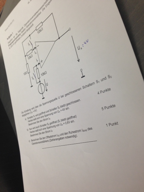 Durch das Öffnen des Schalters erzeugt der Eingangsstrom eine "virtuelle" EIngngsspannung die dazu führt, dass eben 4V am Ausgang enstehen. Unter der Annahme, dass die Offsetspannung 0V beträgt lässt sich damit der Eingangsstrom ausrechnen. Somit ist die Aufgabe klar gestellt.