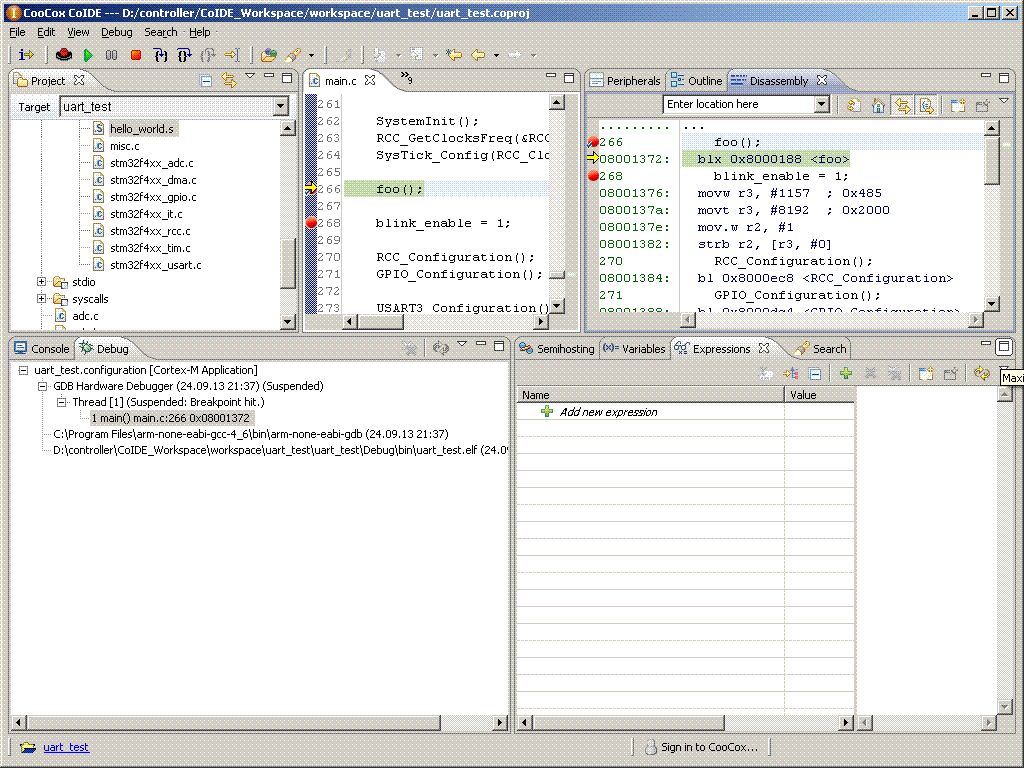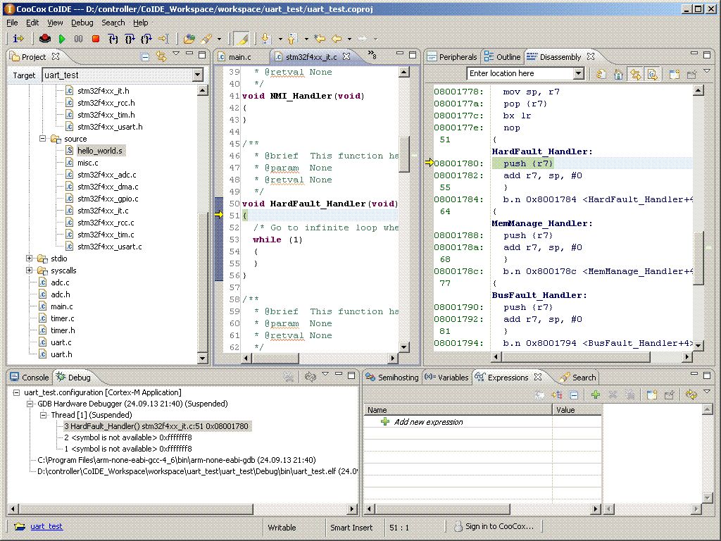 Hallo ! Ich habe gerade ein (=mein erstes) Assembler File erstellt (genauer: aus einer Internetquelle kopiert). Darin ist eine Funktion foo definiert, die ich von C aus aufrufen möchte. Dazu habe ich in (eine bereits vorhandene) main.c den Prototypen für foo eingehängt. Beim Aufruf fooU() kommt es zu einem "HardFault" (siehe Bild). Was mache ich da falsch? PS: foo() ist jetzt nach SystemInit() - geht aber trotzdem nicht!