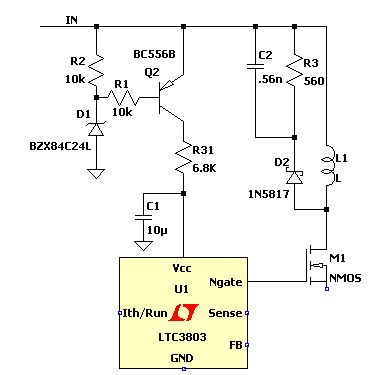 Hi, also das mit der Zenerdiode wird so nicht funktionieren. Damit bei 25V genügend Strom in den Pin VCC fließen kann, müsste der R31 so klein sein, dass bei 55 Volt der max. Strom überschritten wird. Beim Snubber fehlt die Diode. Grüße