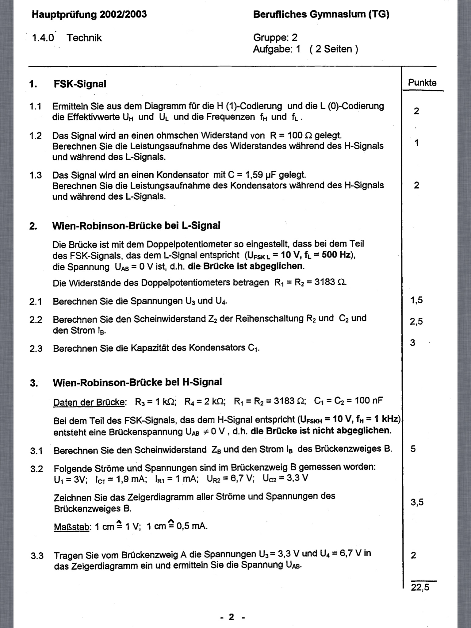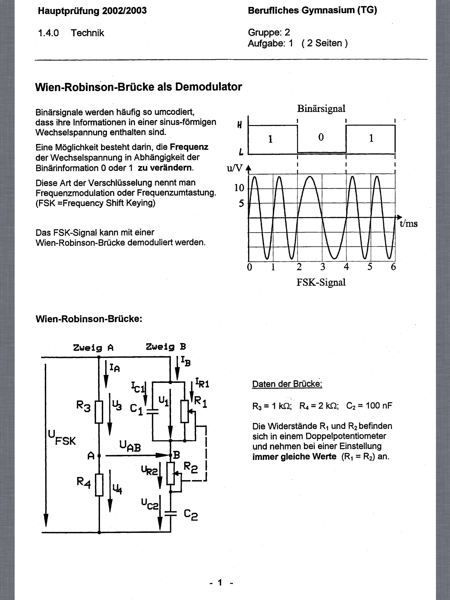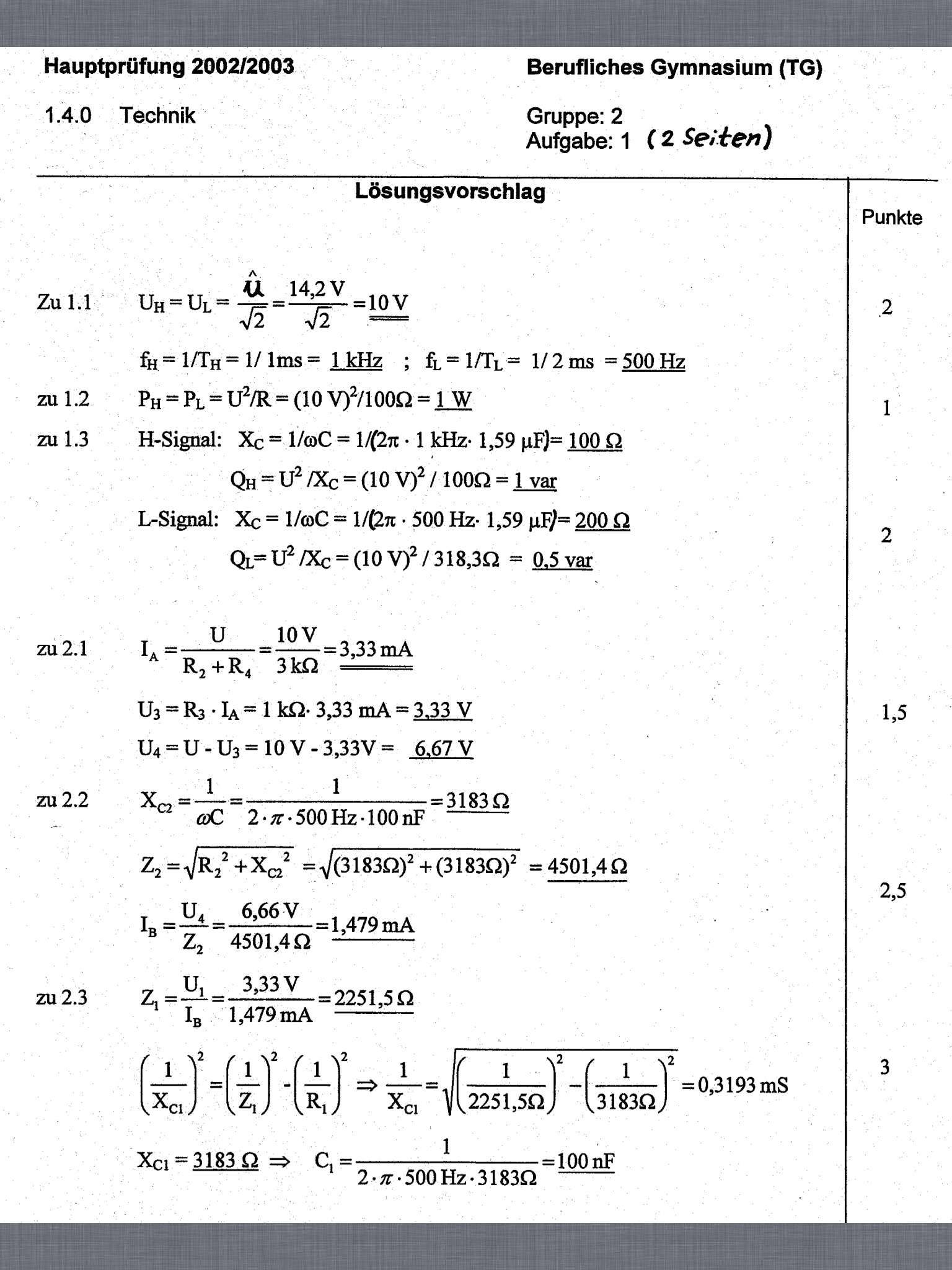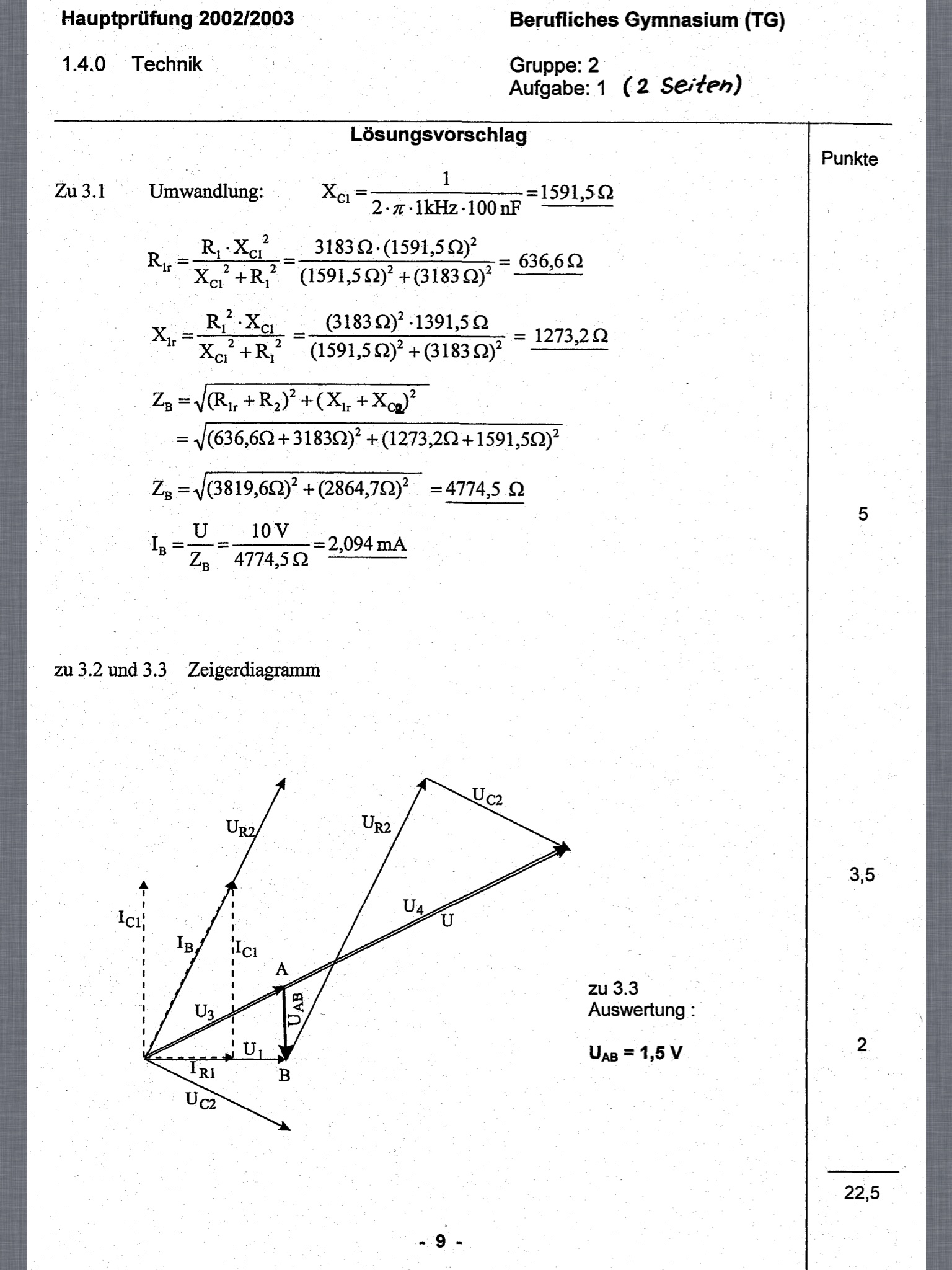Hi, Habe da so eine Aufgabe bei meiner täglichen Internetwanderung gefunden. Ich habe mir zuerst mal nur den Zweig B angeschaut mit den Kondensatoren. Wenn ich zwischen Impedanzen 1 und Impedanz zwei ein oszilloskop anschließe würde ich doch den phasenwinkel der Spannung an Impedanz zwei sehen können. Oder ist das falsch. Also ok ich weiß die gewünschte Spannung und den phasenwinkel von Impedanz zwei. Nämlich 0 Grad. Jetzt weiß ich natürlich wenn Impedanz e^j-45* hat muss der Strom +45* haben. Dann würde ich sagen 3183+ sqrt(2) <-45* * 1,03<45* + (3183*sqrt(2))/2<-45*I Jetzt sehe ich, dass sich das alles wegkürzt und reel wird. In der Aufgabe sind die gleich davon ausgegangen, dass an Impedanz 1 6,66 V Abfällen. Da jetzt meine Frage glaube das ist eine Abituraufgabe, die haben also von komplexen Zahlen noch nie was gehört, da diese zur höheren Mathematik gehören. Gibt es da irgendeine Regel, die das erlaubt einfach so zu addieren. Ich habe das jetzt über komplexe Zahlen bewiesen, das die Spannungen rein reelle Größen sind. Aber in einer Schule glaube ich das nicht. Ist von euch einer Schüler/ Lehrer an solch einer Schule und kann mir sagen, wie das dort ohne Komplexe Zahlen gemacht wird. An die Moderatoren. Falls es verboten sein sollte solch ein Dokument hier zu posten. Dann würde ich darum bitten es zu entfernen ich poste dann den Link.(ich denke halt ist ein offizielles Dokument, welches offiziell online gestellt wurde. Aber falls es eine uhrheberrechtsverletzung ist dann bitte entfernen)