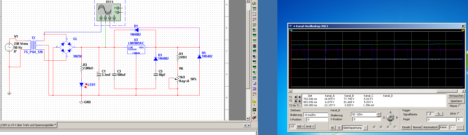 Die Spannungswerte, die ich über mein Oszi messe, wundern mich bisschen. Kanal A: -109,1 mV Kanal B: -51,276 V Kanal C: 47,490 V Kanal D: -48,932 V Eigentlich müssten doch folgende Werte gemessen werden: Kanal A: 230 V Kanal B: Hängt vom Trafo ab Kanal C: 15 V Kanal D: -15 V Habe ich vielleicht einen Denkfehler?? Edit: Im Anhang findet ihr ein Bild von der aktuellen Schaltung.