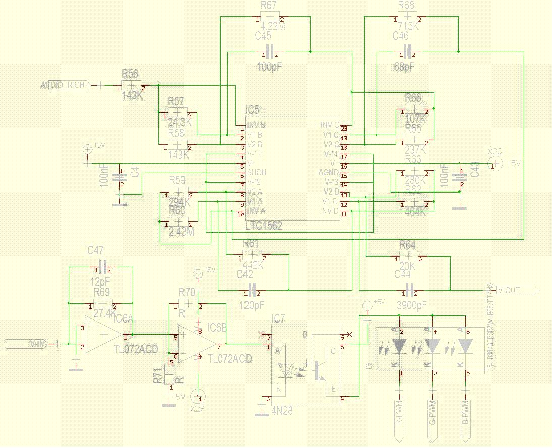 Hallo, habe mit obiger Schaltung folgendes Problem. Beschreibung der Schaltung: LTC1562 ist ein Hochpass 8.Ordnung ca. 19KHz. Audio In ist ein Audiosignal. LTC1562 Ausgang TL072 ist ein Tiefpass danach kommt ein Oparationsverst. dann Optokoppler der die RGB LED betreibt ... Problem: immer wenn die LED aufleuchtet hört man im Kopfhörer ein Störsignal (Surren) ... Habt ihr vielleicht Vorschläge um dieses Surren zu beseitigen? Dank im Vorraus, Jochen