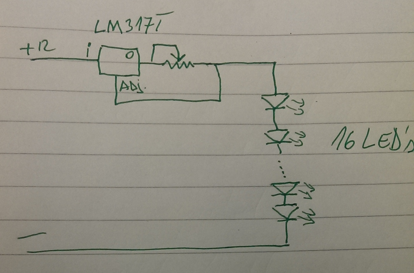 12V für 16 LEDs ? Was für ZauberLEDs sollen das sein ? eher 38V bis 62V. Und das Poti darf nicht unter 120 Ohm gestellt werden, also besser ein 120 Ohm Festwiderstand in Reihe, desweiteren muss es 10mA aushalten, aber beispielsweise bei einem 1000 Ohm Poti 0.1 Watt.