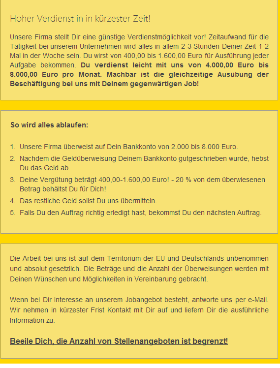 Darüber kam vor Kurzem esrt ein Bericht im MDR. Eine arbeitslose Frau wußte sich nicht anders zu helfen, als diese Art "Arbeitsangebot" anzunehmen. Man hatte sie dann wegen Beihilfe zur Geldwäsche beim Wickel. :-( MfG Paul