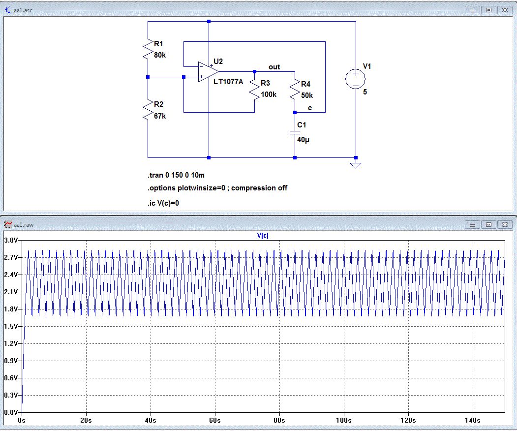 > es schwingt sich erst nach einer Verzögerung ein Weil der Kondensator nach einer TRAN Analyse einen blöden Mittelwert hat, bei dem der OpAmp gerade eben eine stabile Spannung im linearen Bereich halten kann. Und aus dem blöden analogen Zustand muss er erst mal wieder rasukommen, Helmuts .ic V(c)=0 ist da die Lösung. > - Rauschquelle in Serie zur Speisung oder an einem Eingang > - Kurzer Impuls (mit Schalter und evt. über Widerstände) an einem > Eingang des OPAMPs Quatsch, die Schaltung ist einer der wenigen Oszillatoren die in der Realität sicher anschwingt, zumindest so lange die Versorgungsspannugn schneller ansteigt als sich der Kondenstaor aufladen kann.
