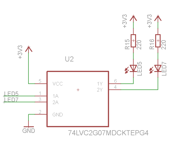 Servus Leute, ich möchte einen Open Drain Treiber verwenden um zwei LEDs von einem µC I/O zu treiben (Schaltplan im Anhang). Ich habe bei RS-Components diesen gefunden, der mir wegen des kompaktem Footprints sympatisch ist: http://www.ti.com/lit/ds/symlink/sn74lvc2g06.pdf Im Datenblatt steht, dass der bei 3V 24mA treiben kann. Ich will eine LED mit 3,3V ansteuern. Den Strom durch die LED möchte ich mit Vorwiderstand auf etwa 20 mA begrenzen. Glaubt Ihr, dass das eine gut Idee ist, oder meint Ihr dass der Buffer-Baustein zu knapp dimensioniert ist? Mich macht auch die Angabe im Datenblatt "The maximum sink current is 32 mA" etwas unsicher. Ich hoffe doch dass da der maximale "sink current" pro Ausgang gemeint ist (und nicht insgesamt). Was meint Ihr?