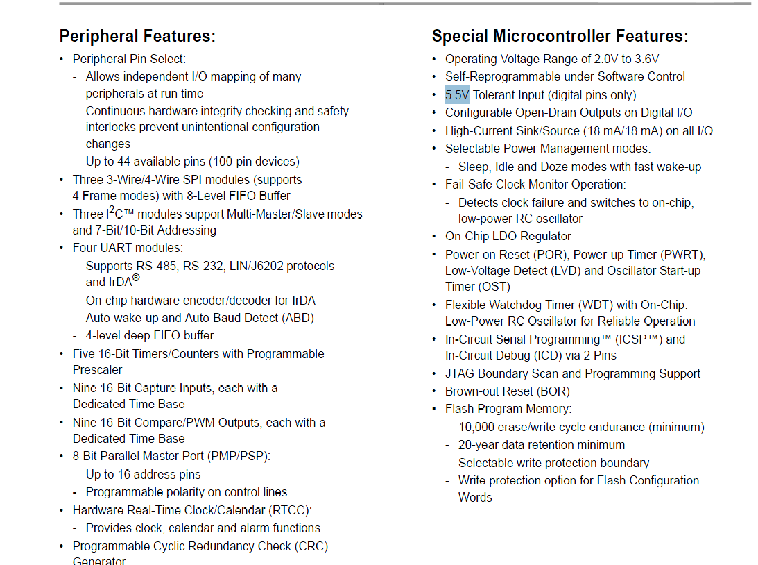 Hi, Hab hier einen Mikrocontroller von Microchip, es steht im Datenblatt folgendes (5.5V Tolerant Input (digital pins only)) das heist jetzt für mich wenn ich irgendeinen Pin als Eingang defeniere dann ist er auch 5.5V Tolerant! Oder verstehe ich das Falsch???