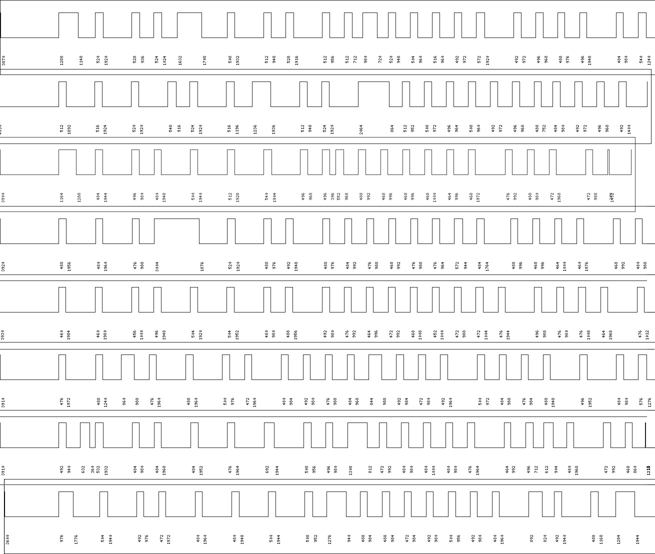 was meinst Du mit 'demoduliert' ? Das erste Bild 'schwarzes Protokoll auf weisem Grund' entspricht dem 'weissen Protokoll auf schwazem Grund' - ist nur im gimp invertiert. Die Daten kommen aus der Empfangsroutine des µC: Beispiel: 3940,492,1940,500,1928,484,984,456,1984,492,1956,516,1732,492,1004,452,1 976,488,988,472,1028,404,1008,472,992,456,1012,444,1024,468,980,488,992, 440,1068,412,1992,464,1980,440,2256,432,2004,436,1988,452,1016,436,1024, 456,2004,428,2004,432,2024,420,2024,416,1016,480,1968,452,1012,468,1960, 460,2016,444,992,460,1028,448,1028