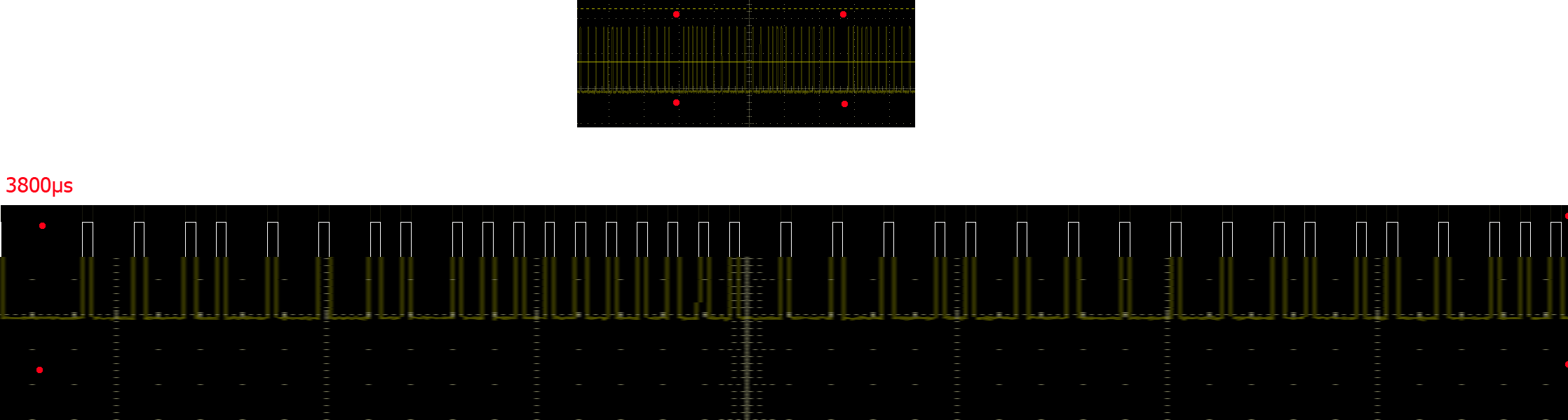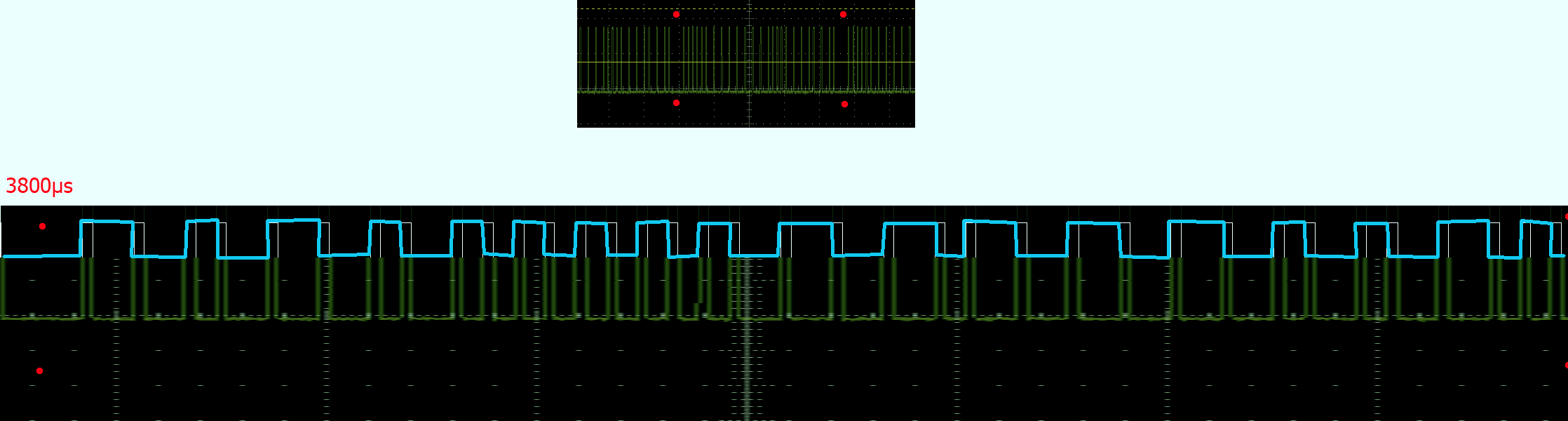 Hi, ja - das waren 8 Telegramme. Ich habe mir das mal auf dem Oszi angesehen. Nicht dass da was verloren geht !? Das Telegramm wird 12mal mit gleichem Inhalt gesendet, dazwischen ist eine Pause von 3800µS. Sind 36 'Pulse' pro Telegram. Ich habe das Oszibild (unten in gelb/grün) mal deckungsgleich mit der µC auswertung (unten in weiss) gezogen - das stimmt jedenfalls... Oben ist der Ausschnitt zu sehen, ...