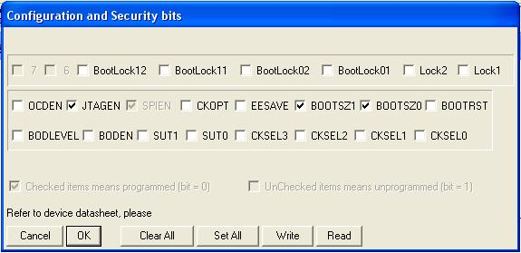 Hallo, ich bin mir nicht sicher ob ich die Fuses richtig gesetzt habe. Als µC verwende ich ein ATMega32 und ein 16MHz Quarz. Im Anhang ist noch ein screenshot. MFG