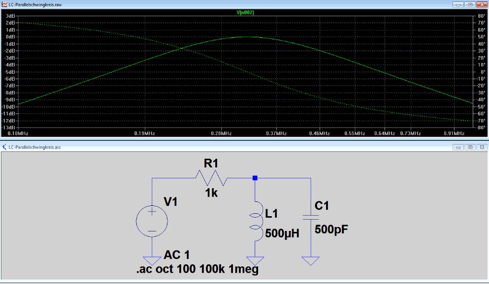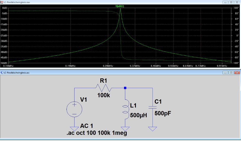Hallo, ich würde gerne die Resonanzfrequenz des parallelen Schwingkreises mit LTspice simulieren, aber bekomme es nicht hin. Bild 1 zeigt das die Amplitude bei mir 0 ist. Die Phasenamplitude?? deutet die korrekte (ausgerechnet) Resonanzfrequenz an. (soll bei 127 kHz liegen) Die Spule soll eine Frequenz im Kilobereich (in etwa der Resonanzfrequenz) empfangen und damit das funktioniert habe ich eine Spannungsquelle geschaltet, die die Frequenz ausgibt. Die Spannung ist im zweistelligen mV-Bereich. Das Ergebnis (nicht die Werte) der Kurve sollte doch in etwa wie in Bild 2 aussehen. Was muss ich einstellen?