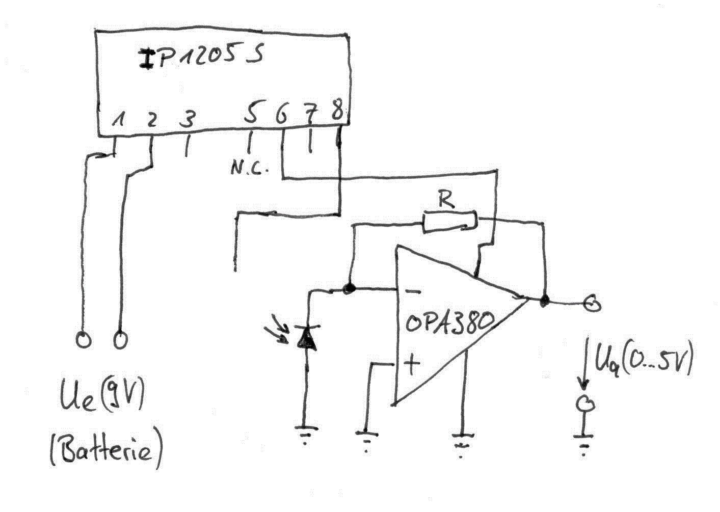 Also erstmal vielen Dank für die Antworten! :) Die Bauteile die ihr mir vorgeschlagen habt gibt es allerding bei Farnell.com nicht =( Und ich kann da kostenlos über meinen Bruder bestellen:) Ich dachte meine Diode ist gut weil sie eine große Fläche hat, ist das nicht so? Also ich hab jetzt neue Bauteile rausgesucht. Sind die in Ordnung soweit? Diode: 1. Die Fotodiode muss ich ja laut Datenblatt des OPA380 nicht einer Vorspannung betreiben. Allerdings hab ich jetzt gelesen das eine Vorspannung die Kapazität senkt. Deshalb auch ein Spannungsregler mit +/- 5Volt. 2. Was soll ich am besten bei "Wavelength of Peak Sensitivity" aussuchen? Eher hoch oder niedrig? Wenn ich nachher von schwarz zu weiß messen will, mess ich ja einmal eine hohe und einmal eine niedrige Wellenlänge.. Deshalb denke ich es ist wohl ein Mittelwert am besten, oder? Ich habe jetzt die hier gesucht & gefunden :) Wäre die was? Hab das eben mit dem kleiner oder großer Fläche noch nicht kapiert. Also was da besser ist. http://de.farnell.com/vishay/bpw21r/foto-diode-560nm/dp/1045427 Spannungsregler: Als Spannungsregler habe ich jetzt den hier genommen, da er einmal +5 Volt und einmal -5V liefert. Mit den -5 Volt kann ich die Diode unter Vorspannung betreiben und mit den +5 Volt kann ich meinen Operationsverstärker betreiben. Das mit dem Widerstand "über" dem Regler hab ich noch nicht kapiert mit dem Durchprobieren. Also mein Display hat 250cd laut Datenblatt und ich will 0 Volt - 5 Volt am Ausgang meiner Schaltung. http://de.farnell.com/xp-power/ip1205s/dc-dc-wandler-3w-4-1-i-p5v-o-p/dp/1859155 Operationsverstärker: Er verträgt doch nur 5V laut Datenblatt. Keine 5,5V wie auf farnell.com steht. Passt ja aber mit meinem Spannungsregler. http://de.farnell.com/texas-instruments/opa380aidg4/amp-transimpedance-smd-soic8-380/dp/1180147?ref=lookahead Hab noch meine Zeichnung angehängt. So sollte es dann aussehen. Nur wo muss Pin 8 von dem Spannungsregler an die Diode angeschlossen werden damit sie mit den -5 Volt betrieben wird?