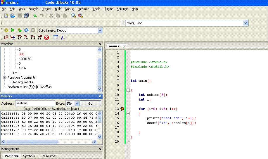 Im Watches-Fenster kann man auch die Werte über dem i = 1 sehen.