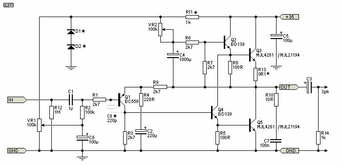 Je genauer ich mir die obige Schaltung ansehe, umso mehr gruselts mich. Q3,Q4,Q5 ist die klassische TTL-Gatter Ausgangsstufe, gut für digital, aber völlig ungeeignet für analog. Klirrfaktor läßt grüßen. C von Q4 an E von Q2. Da kann sich Q4 abquälen, wie er will, gegen den Emitterfolger kommt er nicht an. Man könnte C von Q4 also genausogut an +35V legen. An R7 wird eine Spannung eingestellt als Arbeitspunkt. Dahinter kommen Q2,Q3 als Darlington, also mit einer Drift von -4mV/°C auf ne Last von 0,1R (R13). Damit driftet der Arbeitspunkt mit satten 40mA/°C, na super. Wir drehen den Verstärker jetzt mal auf, der Kühlkörper erwärmt sich von 20°C auf 60°C und wir haben einen Anstieg der Ruheleistung um 56W! Die Schaltung verglüht definitiv eher früher als später. Ich vermute mal, die Schaltung hat ein hauptberuflicher Tischler entwickelt. Mit Elektronik steht er jedenfalls auf Kriegsfuß.