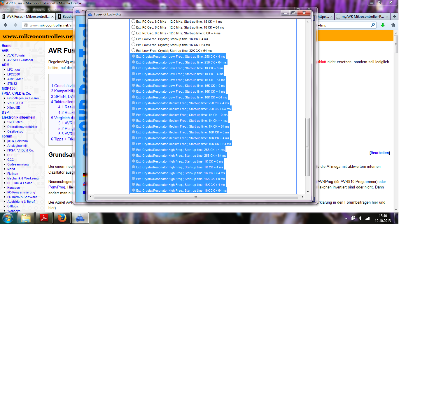 Hallo, ich versuche einen externen Quarz 8 mhz an einen Atmega32 anzuschließen. Leider habe ich keine Erfahrung und die Einstellungen im AVR-ProgTool verwirren mich ein wenig. Meine Frage wäre, was bedeutet bespielsweise die Einstellungsendung 1K CK + Oms (siehe Anhang/Bild)? Oder was wäre die richtige/optimale Einstellung? Vielen Dank schonmal... Gruß Christian