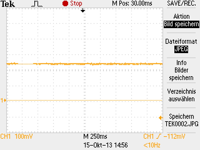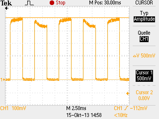 Guten Tag, ich würde gerne die Ausgangsspannung eines Schaltnetzteils, das eine analoge Schnittstelle besitzt, mittels gefiltertem PWM-Signal (DAU) eines µC steuern. Während der Einschaltzeit des Rechtecksignals liegen aber nur im Ausnahmefall 5V an, in der Regel bleibt das Signal darunter. Ich habe ein Bild (Tastverhältnis 50%) beigefügt. Das danach gefilterte Signal liegt dementsprechend unter dem gewünschten Wert von 2,5V. Da sich dieser Fehler linear über das Tastverhältnis verhält, kann man ihn sicher nachträglich korrigieren, ich würde aber gerne wissen, ob nicht bereits das PWM-Signal ungewöhnlich/fehlerhaft ist. (PWM, Phase correct) Mit besten Wünschen Christoph