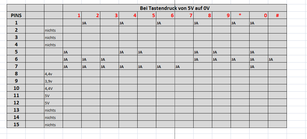 Hallo Roland, Ich verstehe deine Frage nicht ganz. Du hast doch schon die vier Datenleitungen (1,5,6 und 7) ausfindig gemacht, in denen die Tasteninformation deiner Tastatur codiert sind. Im Datenblatt würde auch nicht anderes stehen als die Tabelle, die du dir nun mit deinem Messgerät selbst erstellt hast. Zur Auswertung deiner Tastatur musst du doch jetzt nur noch die Pegel deiner vier Datenleitungen abfragen und auswerten. Grüße, Jan