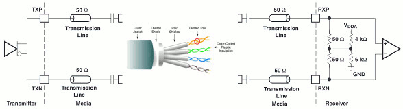 Ich hab noch ein Bild gemacht. Leider ist das CAT7 Media vorgegeben. Ich bin mir einfach nicht sicher ob das mit 2 x 50 Ohme Transmission-Line to RJ45 Differenziell und wieder zurück so gehen wird. Laut Datenblatt gibt es auch noch ein DC Mode.. ?!? Alex