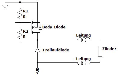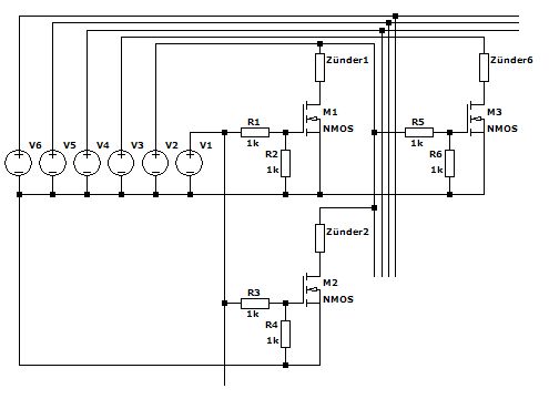 Jepp. So läuft alles über die Diode, die in den Mosfets drin ist ;) Die Schaltung beruht darauf, daß die Mosfets alle Plus schalten und Minus von einer anderen Zündleitung kommt. Daher auch der Hinweis im Plan, daß an den (eingezeichneten) Ausgangsklemmen keine gemeinsame Rückführungsleitung mehr ist. Jedes eingezeichnete Klemmenpaar bedient einen Zünder. Zum Beispiel wird Zünder 1 an X1.1 und X1.2 angeschlossen.