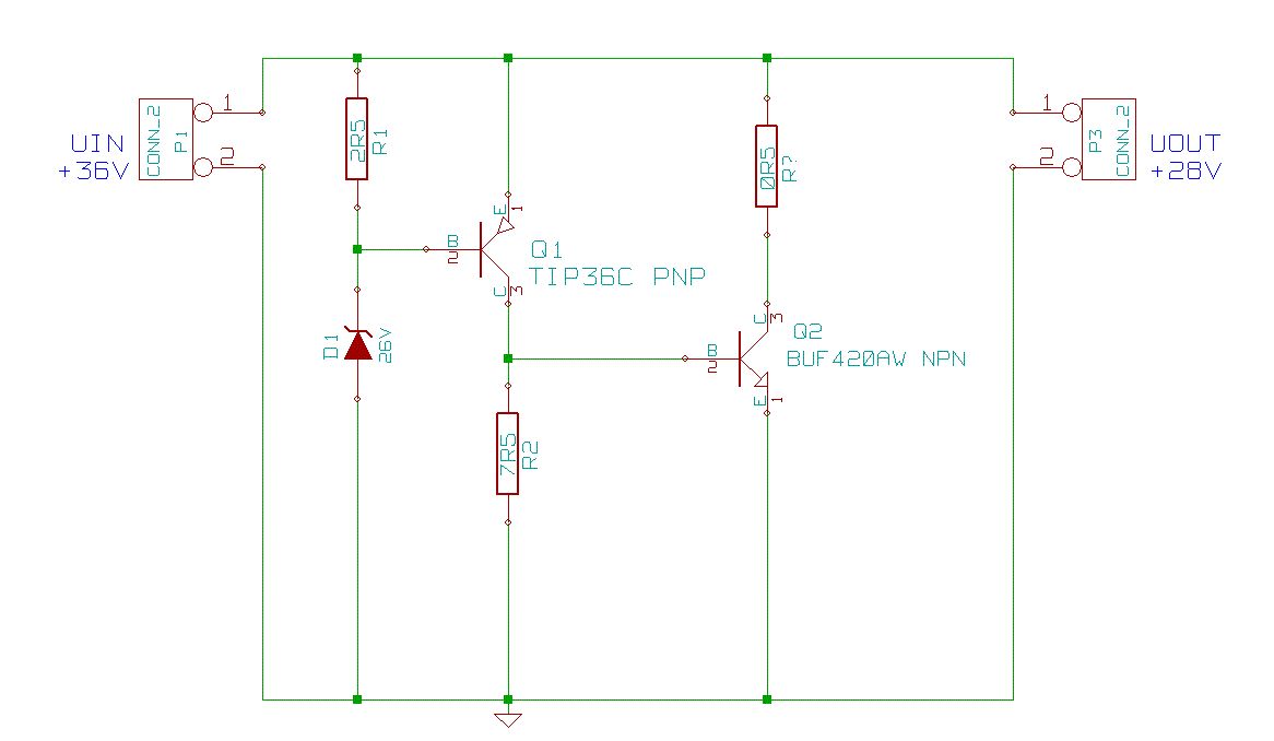 John Drake schrieb: > Was hast denn du für PNP-Transistoren, dass bei ihnen > Basis-Emitter-Spannungen von 10V auftreten? Wenn man an die obige Schaltung 36V bei einer Stromlieferfähigkeit von 20A anlegt, brennt die Basis-Emitterstrecke von Q1 weg und es liegen 26V an D1 und 10V an R1.