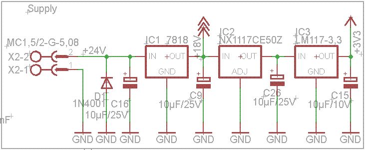 Ok, das ist schlecht. Die Schaltung soll eigentlich für Dauerbetrieb Dimensioniert werden. Ich habe die Daten für die Kondensatoren aus dem jeweiligen Datenblatt. Ja den Kondensator C16 wollte ich größer auslegen das muss ich noch ändern. Was für eine Alternative würdet ihr mir für den NX1117 empfehlen? Ich hatte gedacht das dieser Schaltregler die 18V auf 5V regelt und ich dann von 5V auf 3,3V gehe.