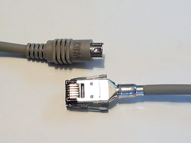 Hallo Leute, ich versuche gerade, mit einem steinalten (~1990) Messgerät zu kommunizieren. Dieses spuckt mir über RS-232 Messwerte aus, allerdings nur, wenn ich einen Fußschalter bediene, der nicht mehr beim Messgerät dabei ist. Nun möchte ich mir da einfach selbst einen nachbauen, allerdings habe ich keinen blassen Schimmer, was das für ein Steckverbinder ist? Sieht ein wenig so aus wie ein LAN-Kabel, hat aber nur 4 Adern und die Flügel außen... Hat irgendjemand eine Ahnung? Schonmal 1000 Dank im Voraus! Phil P.S.: Falls ich hier völlig Off-topic bin, wäre ich auch über eine Richtung dankbar, wo ich besser aufgehoben wäre :-)