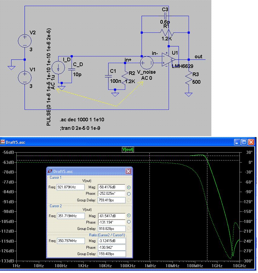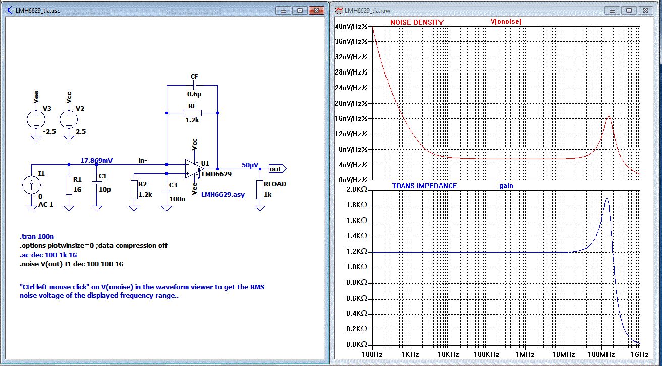 Im Anhang mal ein Beispiel wie man so etwas, speziell mit LTspice, effektiv simulieren kann. Verstärkung und Rauschen in einem Plot. Was will man mehr. Der LMH6629 hat ja einen unglücklich hohen Ibias. Da sollte es besseres geben. Einfach den zip-File in einem beliebigen Verzeichnis auspacken und dann Doppelklick auf den .asc-File. Man sollte natürlich bereits LTspice installiert haben. LTspice ist kostenloses SPICE von www.linear.com
