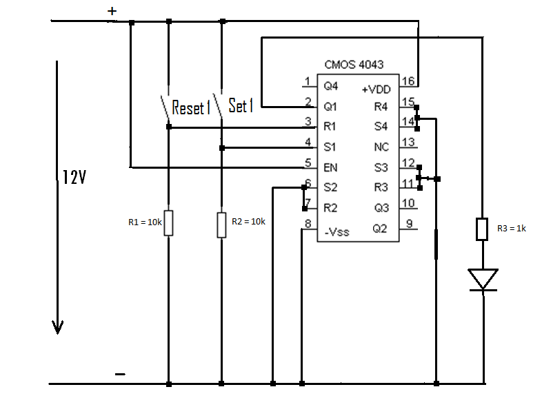 Hallo, erstmal bitte ich um Nachsicht.Ich kenne mich mit der Elektronik/Elektrotechnik (noch) nicht wirklich aus, mache also grade meine ersten "Gehversuche" was Schaltungen etc. angeht. Jetzt zu meinem Problem: Ich wollte eine einfache LED per Taster(nicht Schalter sondern Taster) mit Hilfe eines RS-NOR IC's(CD4043) schalten. Habe hierzu auch Gott sei Dank eine sehr ähnliche Schaltung hier im Forum gefunden und sie für mich angepasst (Danke an dieser Stelle an den Zeichner des Schaltplans, hoffe das ist ok wenn ich diesen hier abgeändert verwende; Quelle: Beitrag "IC RS-FlipFlop Schaltung!"). Habe das ganze auch mal auf einem Labor-Steckbrett nachgebaut. Das Problem dabei ist: Die LED leuchtet die ganze Zeit. Egal ob ich set/reset drücke. Komischerweise scheinen alle Ausgänge (Q1-Q4) auf High zu liegen. Jedenfalls leuchtet die LED egal an welchem Port ich sie anschließe. Habe ich einen kolossalen Denkfehler in meiner Schaltung oder liegt es an irgendetwas anderem? Vielen Dank schonmal LG Guildejo