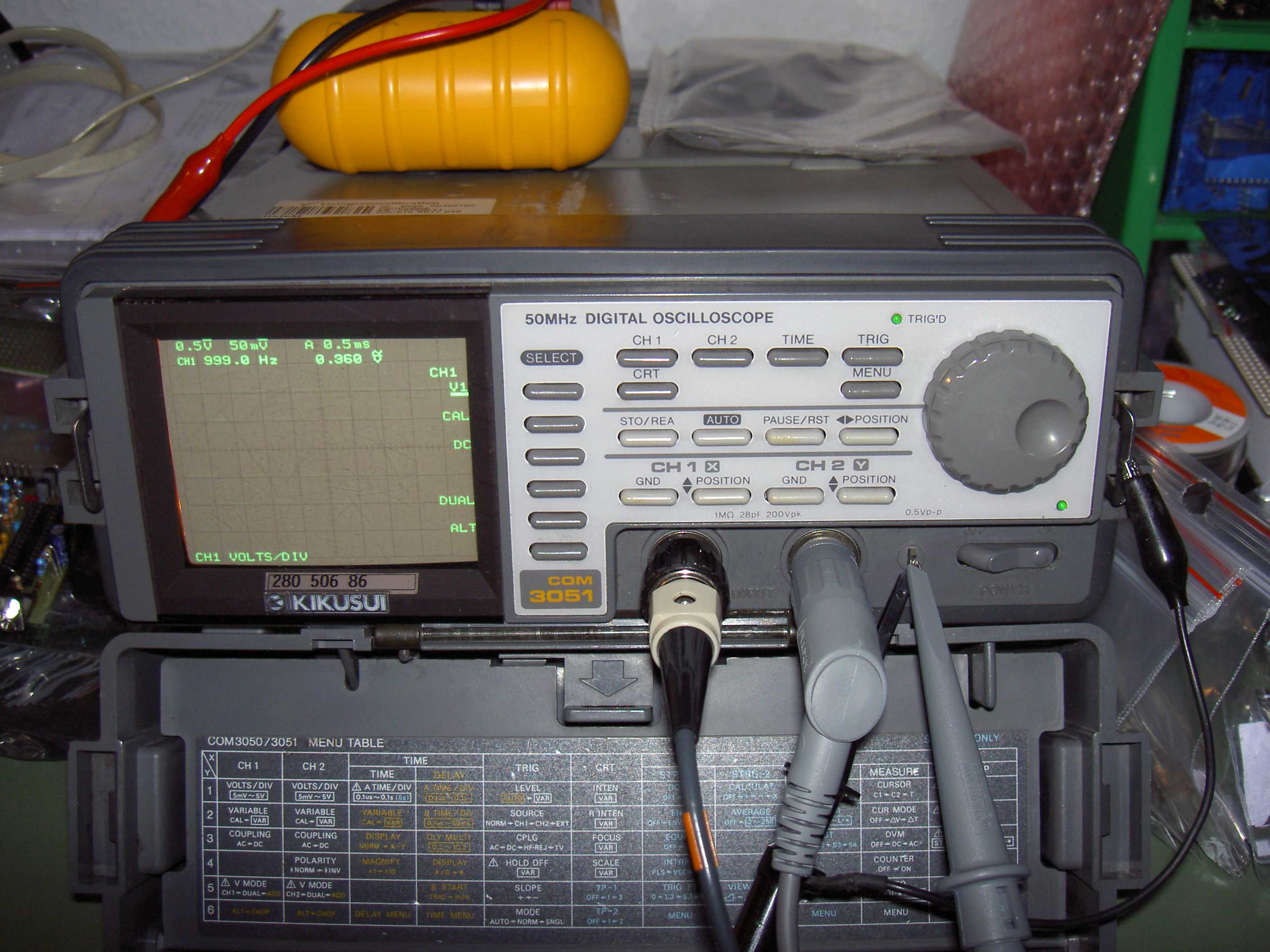 Hallo buffy Bis jetzt wissen wir folgendes: Geräteart: DSO 2 Kanäle Hersteller: Kikusui http://www.kikusui.co.jp/en/ Typ: COM 3051 Analogbandbreite: 50 MHz Maximale Sampelrate: 1 GHz (real-time ?) Neupreis: 5000 DM (Neupreis damals ??) VB: 900 Euro Auflösung: (??) 8 bit ?? Speichertiefe: (??) Y- Ablenkkoeffizienten: (??) [V/div] X- Ablenkkoeffizienten: (??) [s/div] Alter: (??) ... Wenn du dein Gerät verkaufen willst, mach nicht immer so sparsame Angaben. MfG Holger