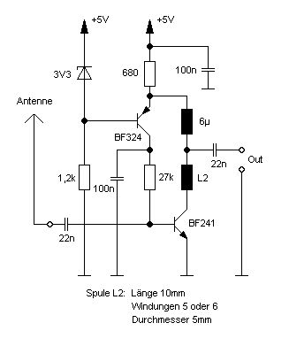 Unabhängig von diesem Thread hier hab ich heute mit den beiden "Radio-Chips" TDA7021 (keine Controllersteuerung) und dem RDA5807 "herumgespielt". Genau wegen der Empfangsempfindlichkeit dieser Chips(der RDA5807 wird mit ATmega168 und AVR-GCC Programm angefahren). Weil die Eingangsempfindlichkeit der Antenne wirklich nicht soooooo der "Bringer" ist hab ich eben genau daran "gespielt". Ich kann zwar (mangels Meßgeräten) nicht den db- Gewinn angeben die meine Schaltung erreicht, ich kann nur sagen, dass der Empfang (sehr) merklich besser geworden ist. Wer die Schaltung also gebrauchen kann: Bitte bedienen (für die Benutzer des RDA5807 hier: der Ausgang des Verstärkers ist Pin 5 des RDA5807 anzuschließen). Zu den Transistoren: Sie sind deshalb gewählt worden, weil ich sie hatte (smile sie waren halt schon sehr lange die preiswertesten die Rei**** im Sortiment hat). Viel Erfolg, Ralph