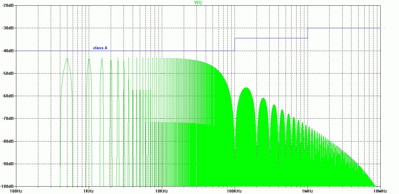 Hallo, Speziell bei der FTT bleibt "nur" das Zeichnen mit "Notes % Annotations". Plot Settings -> Notes & Annotations Lines, Text Dabei kann man die Farbe und den Linienstil wählen. 1. FFT durchführen 2. X und y-Achse bei Bedarf anpassen. 3. Mit "Notes & ..." die Grenzwertkurve eintragen. 4. Diesen FFT Plot speichern mit Plot Settings -> Save Plot Settings Diese Plot Settings File kannst du auch in anderen FFTs später laden. Damit brauchst du das nur einmal zeichnen. Plot Settings -> Load Plot Settings Mit der nachfolgenden SPICE-Zeile habe ich die Datenkompression abgeschaltet um die maximale Genauigkeit der FFT zu erreichen.(Siehe Schaltplan) .options plotwinsize=0 Bei der .AC Analyse könnte man auch mittels B-freq eine Grenzwertkurve definieren. Gruß Helmut