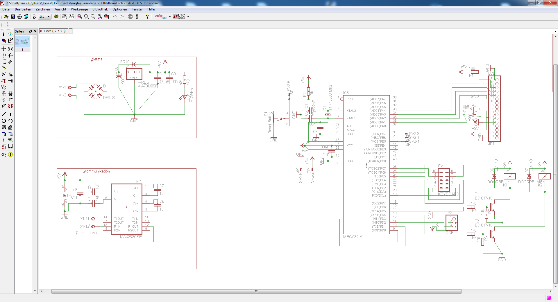 Hallo, ich habe vor einiger Zeit eine Platine designed, auf welcher ein Atmega32 über rs232 mit dem PC kommunizieren soll. Nur will dies nicht funktionieren. Im Anhang findet ihr die Schematik. Als Kondensatoren verwende ich: http://www.reichelt.de/Vielschicht-SMD-G1206-High-Cap/X7R-G1206-1-0-50/3/index.html?&ACTION=3&LA=5000&GROUP=B351D&GROUPID=4340&ARTICLE=89736&START=0&SORT=preis&OFFSET=500 Hat irgendjemand eine Idee? Denn so langsam verzweifel ich dran... Gruß Jonas