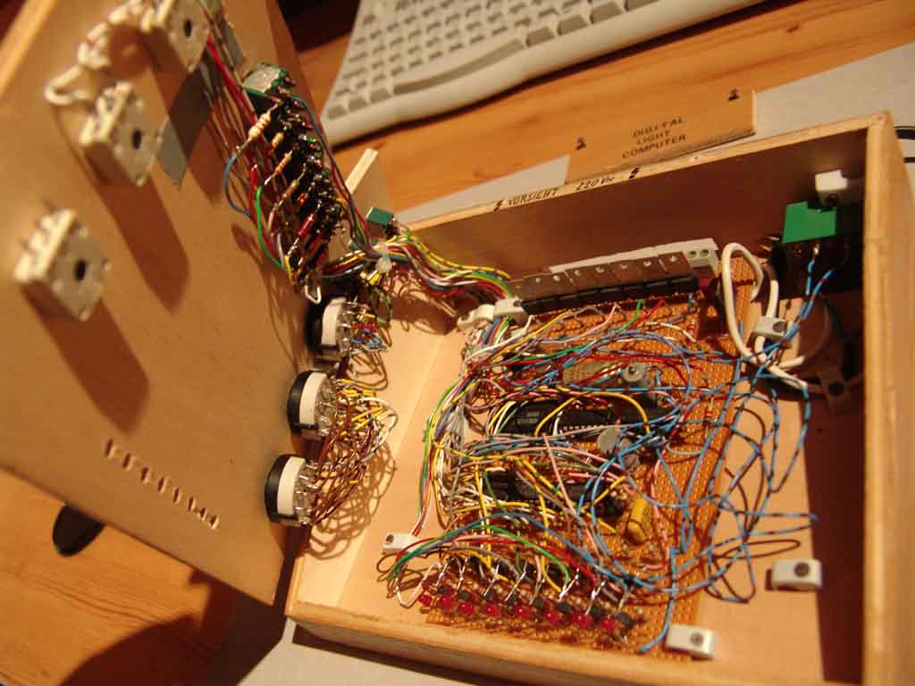Hallo Forum, auf einem Flohmarkt habe ich dieses seltene Kästchen entdeckt. Offensichtlich handelt es sich um ein Licht Pattern Generator aus den 80ern schätze ich. Frage: Gab es solche Schaltungen mal in Elrad oder Elektor? Das Ding geht noch und ich möchte es gerne wenigstens ansatzweise verstehen lernen. Mir ist allerdings schleierhaft was für Lasten der Mini Trafo bei immerhin 220v Ausgang da treiben soll? bin gespannt