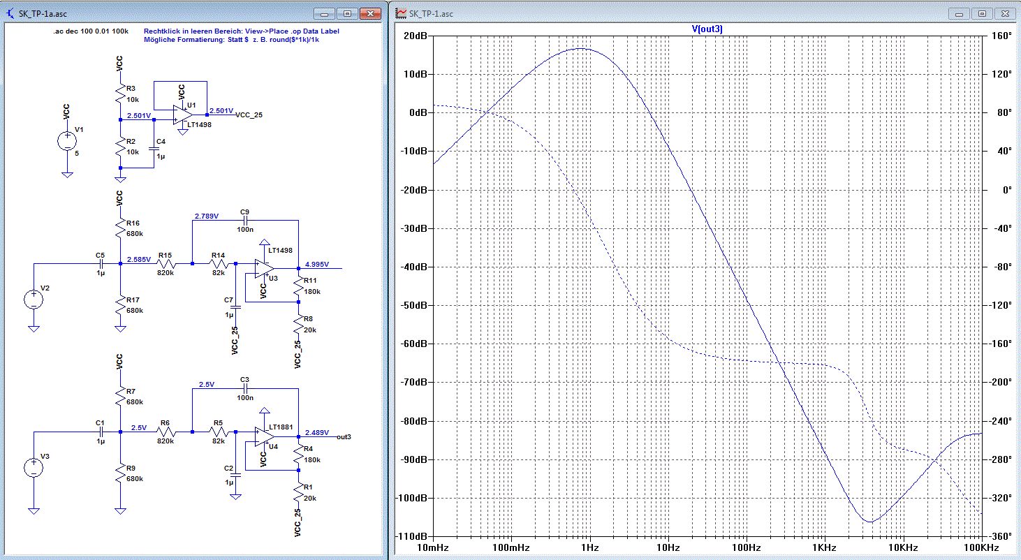Hallo, Ich habe einen Sallen-Key-Filter TP mit einer Grenzfrequenz von etwa 0.3Hz aufgebaut. Nun wollte ich einen Arbeitspunkt von 2.5V festlegen. Leider verstehe ich das Resultierende Ergebnis in der LT-Spice Simulation nicht. Kann mir jemand erklären warum kommt es zu diesem Amplituden- und Phasensprung sowie einer Dämpfung von rund -50dB im Bodediagramm kommt? Ohne Arbeitspunkt funktioniert die Schaltung wie erwartet. Im Anhand sowohl die Schaltung mit Arbeitspunkt sowie ohne. Danke in Voraus