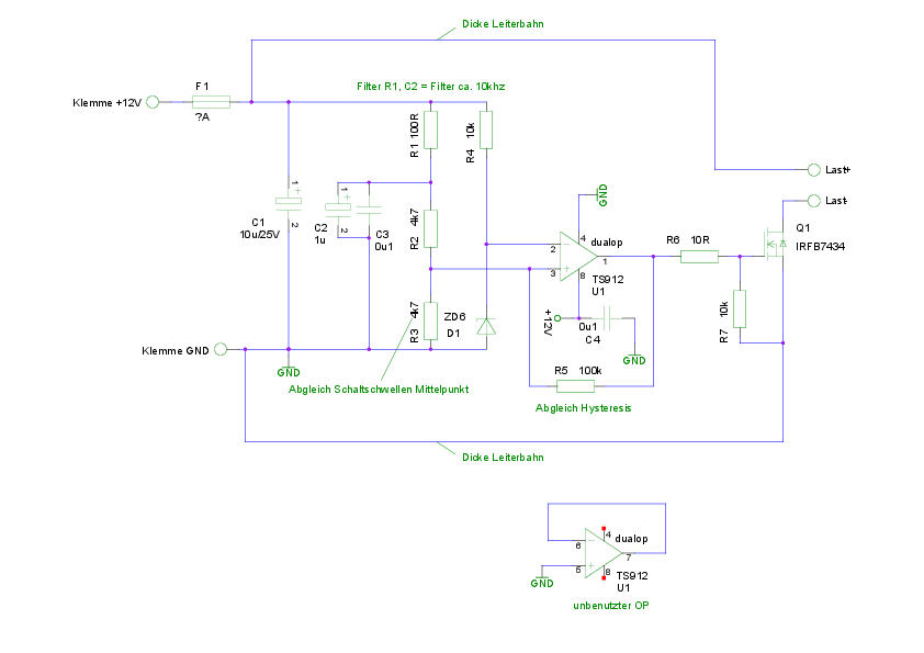 OP schwingt im khz Bereich? Du hast keinen Abblockkondensator von Versorgung + nach GND direkt am OP. Der muß immer rein. Die ZD16 bringt eigentlich nichts ausser die Gefahr ist groß das deine Platine abbrennt. Mach die weg. Es macht noch Sinn den Pegel der in den + Eingang reingeht zu filtern. Das kannst du aber nicht an dem Pin+ direkt machen, da sonst der Schmitt Trigger nicht mehr funktioniert. Was du machen kannst ist vor dem Trim1 noch einen sagen wir mal 100ohm Widerstand zwischen +12V und Trim1 legen. Und vom Punkt 100ohm Widerstand und Trim1 einen Kondensator nach GND legen. Dann hast du ein Filter. Das kann ruhig ein Elko sein mit 0,1uF parallel. Trim1 darf dann nicht mehr zu niederohmig sein, sonst wirkt die Kapazität des Filters wieder zu stark am Eingang des +Pins. Am Besten du machst nochmal ein neues Bild mit den Änderungen. Warum du da 2 TS9121 drin hast???. Übrigens TS9121 kann ich nirgens finden. Du könntest noch ein paar Angaben machen. Bei welchen Spannungen soll der Ein und wieder abschalten. Wie groß ist der Strom? Beachte bei den Lastkreis die nötigen Querschnitte da sich sonst auch noch ein Masseversatz bildet.