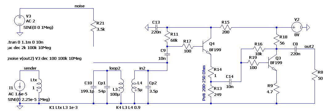 Hallo Frank In der Simulation beträgt das Rauschen 0,8-0,9µV bezogen auf einen Eingangswiderstand von 3,5k und 8kHz Bandbreite. Die rechte Schaltung hat leichte Vorteile bezüglich Rauschen und Regelbereich des Potis -> man kann zurückregeln, bevor verstärkt wird. Auch hat die Ausgangsimpedanz der zweiten Schaltung ~50 Ohm. Mit ca. 80% haben die beiden ersten Transistorstufen den größten Anteil am Rauschen. Da könnte man nochmal ansetzen. PS Die Koppelwicklung hat hoffentlich auch einen Durchmesser von 1 Meter, sonst war die ganze Arbeit für die Katz.