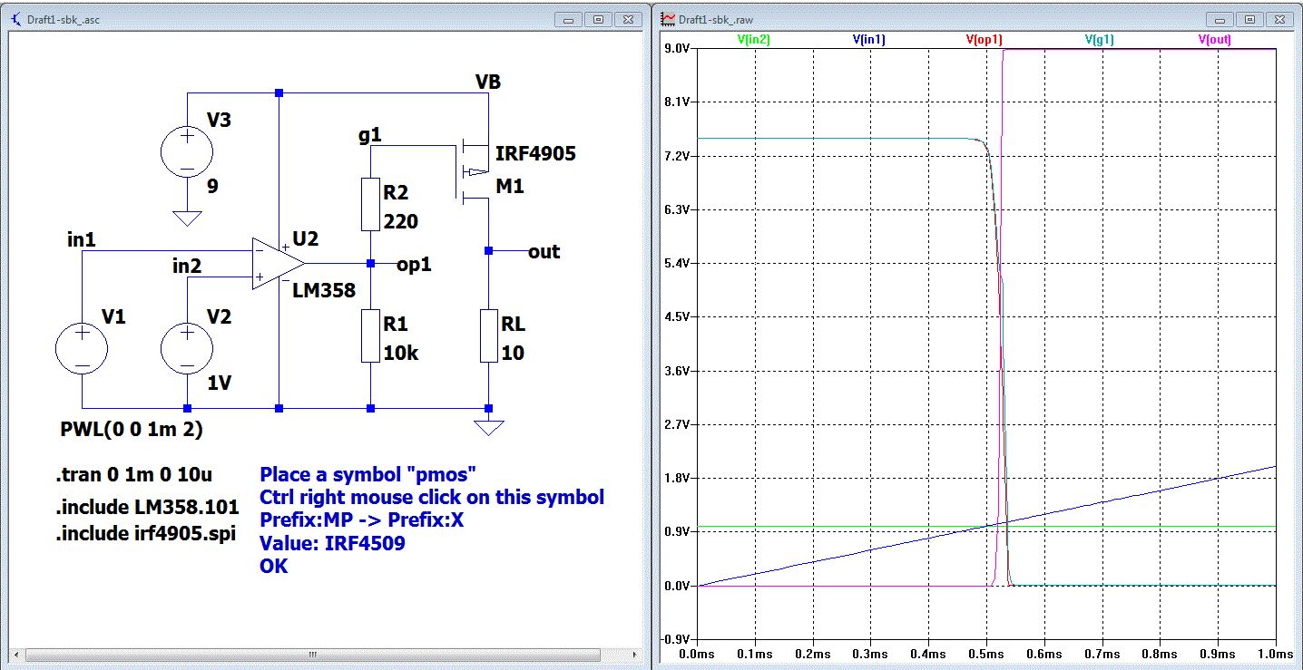 Hallo, Du brauchst gar nichts in irgend einen "entsprechenden" Ordner einfügen. Nimm meine drei Dateien und lege sie in dein Arbeitsverzeichnis. Das Verzeichnis kannst du überall anlegen aber niemals solltest du es unter C:\Programme ...\.... anlegen, weil das ein Systemverzeichnis ist. Beispiel: C:\Meine Schaltungen\Schaltung1 Da kopierst du alle 3 Dateien hinein. Der Vorteil dieser Methode ist es, dass das dann auf jedem Rechner und in jedem beliebigen Verzeichnis auch läuft. Platziere einen pmos Ctrl rechte Maustaste auf das platzierte Symbol Ändere Prefix:MP zu Prefix:X in diesem Dialog X steht für subcircuit Modell. In das Feld Value trägst du den Name des Modells ein, hier IRF4509. OK Jetzt musst du noch mit ".lib" Anweisungen die Files einbinden. Dein gewählter Mosfet will mit 9V bis 10V angesteuert werden. 5V reicht nicht. Gruß Helmut