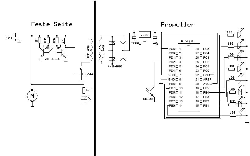 Super Sache das alles Bis vor 3 tagen kannte ich dieses Forum garnicht. ich habe mich auch vor einer Woche mal hingesetzt um mir so ein Drehlicht zu bauen. Zum testen habe ich den 8 Pin AT90S2323 benutzt. Deswegen hatte ich nur 5 Pins für die LED's. Das Ding lief dann mit dem int. 1MHz takt und natürlich völlig unsynchron ;). Aber man konnte ab und zu was lesen ;-). Mein Problem war und ist die Spannungszuführung zu der routierenden Schaltung. Zur zeit habe ich da einen 9 Volt Block drauf gesetzt was eine totale Unwucht zur folge hatte. Wie habt ihr das mit der Spannungszuführung gelöst ? Schleifkontakte ???? oder induziert ihr durch die Routation Spannung auf einer Spule die sich auf der Schaltung befindet ? Wenn das problem gelöst ist, dann werde ich wohl auch den ATmega8 nehmen mit int. 8MHz und 7 LED's. Wäre für Hilfe in Bezug auf Spannungsübertragung sehr dankbar.