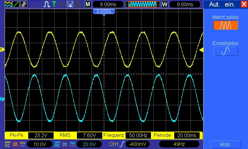 Hallo, habe eine simple Frage...aber lüncht mich bitte nicht :) Habe einen Ringkerntrafo mi5 2x115V(230V) und Sekundär 1x7V bzw 1x18V ! Habe jetzt beide Spannungen mit meinem DSO gemessen(siehe Anhang)...aber warum sind die Phasen von beiden Spannungen verschoben, müssten die nicht gleich sein(übereinander liegen) ?? Danke, für die wahrscheinlich simple Antwort !