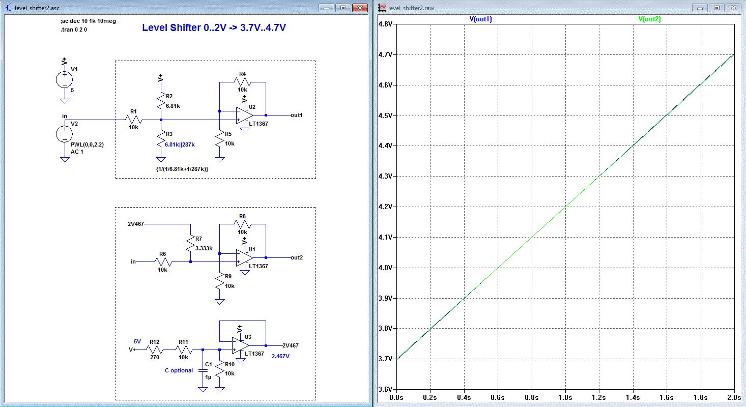 Gibt es Probleme, wenn ich meinen OP (LT1367) mit +5V zu -15V versorgen will? http://cds.linear.com/docs/en/datasheet/1366fb.pdf Die Schaltung soll mir mein Eingangssignal (von 0-2 V) auf das Ausgangssignal (3.7-4.7 V) skalieren und potentialverschieben. Laut LTspice Simulation klappt das. Ich finde das aber noch relativ unschön (mit vier OP's) gelöst...