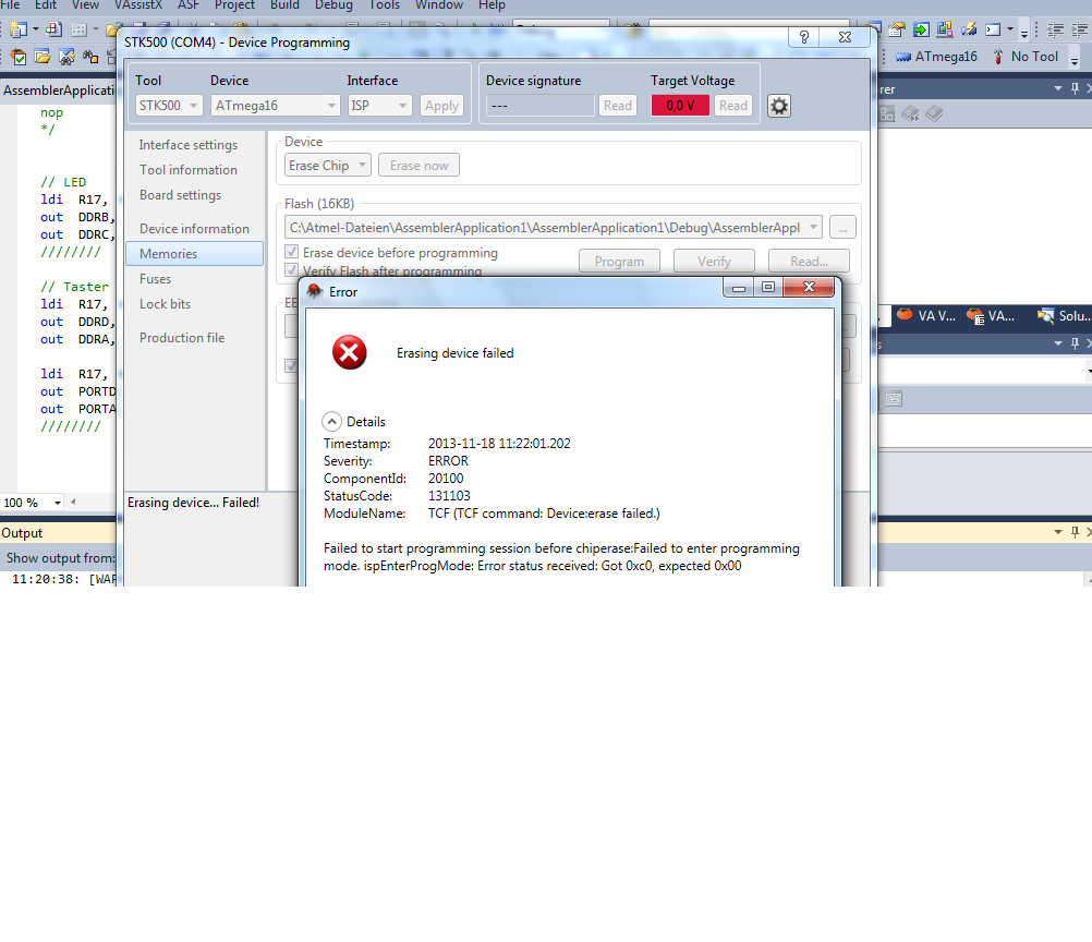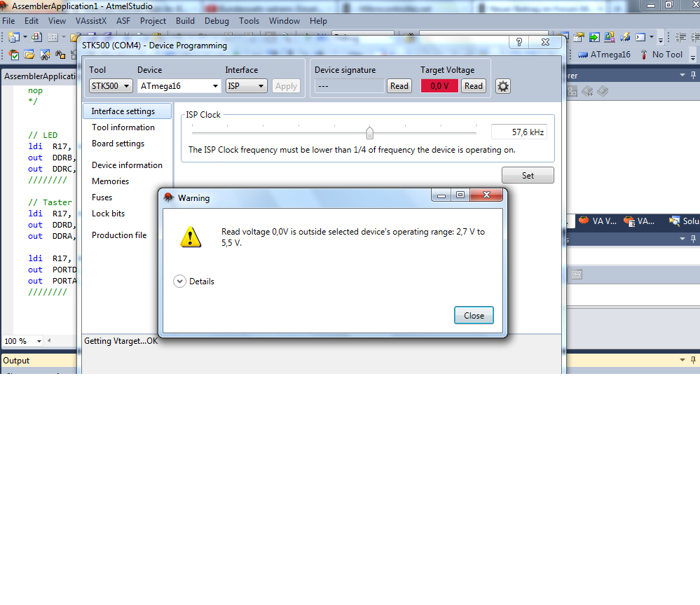 Hallo und willkommen zu meinem ersten Beitrag! Ich habe mir ein Board ähnlich dem STK500 aufgebaut um mit dem ATmega16 ein wenig zu experimentieren. Als Programmer verwende ich einen mysmart usb light und als Programmierumgebung Atmel Studio 6.1 Die Spannungsversorgung erfolgt über einen Festspannungsregeler mit 5V, der Programmer ist definitiv richtig angeschlossen, von 2 Leuten gecheckt. An der Verschaltung kann es eigentlich nicht liegen. Wenn ich den mikrocontroller flashen will, oder auch einfach nur die Spannung auslesen möchte, kommen folgende Fehlermeldungen. Muss ich zur Inbetriebnahme auf jeden Fall einen externen Quarz verwenden oder müssen Fusebits geändert werden? Wer hat eine Idee. Habe schon viel gesucht aber nirgendswo den Fahrler gefunden. Meist waren ähnliche Fehler mit alten Atmel Studio Versionen. Gruß Stephan