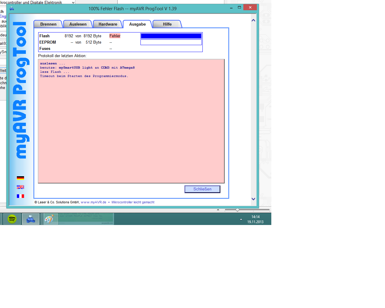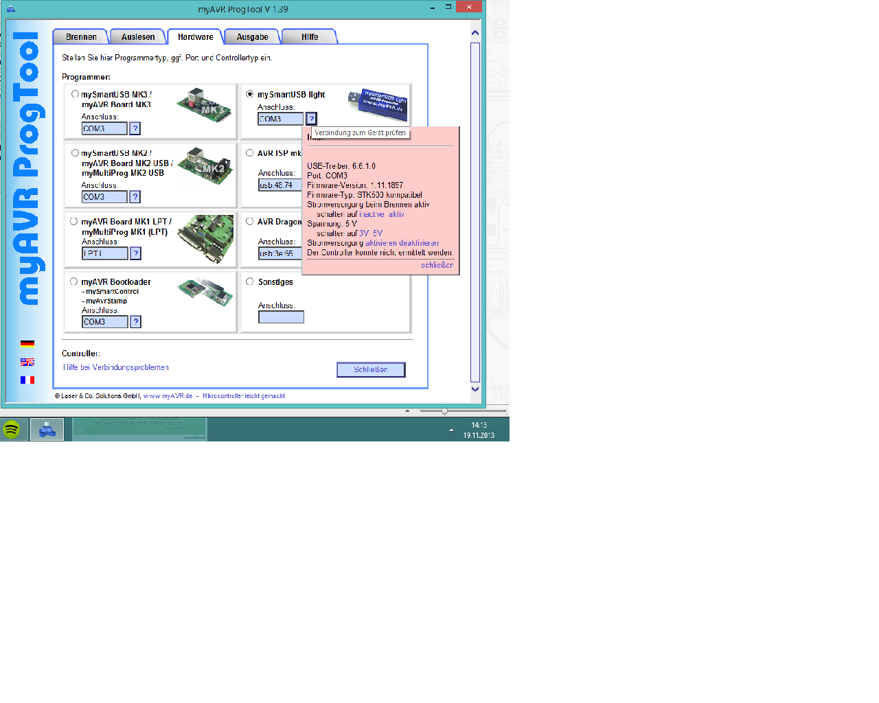 Hallo, Ich habe ein Problem mit meinem mySmartUSB light. Mein ProgTool erkennt es nicht richtig, bzw. gar nicht. (Siehe Bilder) Ich habe 2 Fehler 1. Wenn ich ihn auslesen lasse kommt : "Timeout beim Starten des Programmiermodus." 2. Unter Hardware "Fragezeichen" Der Controller konnte nicht ermittelt werden. Ich benutze Windows 8, habe alle Pins richtig angeschlossen (bin mir zu 100% sicher), jedoch funktioniert das immer noch nicht. Habe es schon auf einem anderen PC ausprobiert, der selbe Fehler. Kann mir da einer weiterhelfen, google hat mir nicht wirklich geholfen, nachdem ich das Problem gestern mehr als 6 Stunden versucht habe zu beheben. PS: Die SupportBox_MSUL erkennt ihn auch nicht!